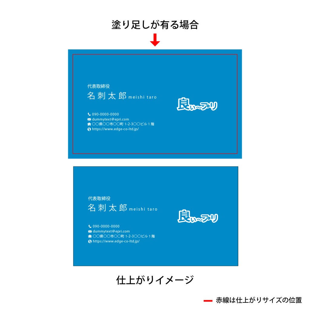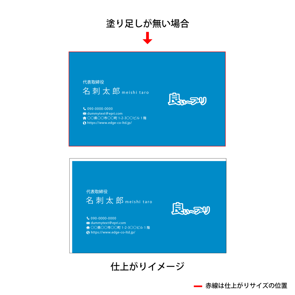 塗り足しを付けていないデータで、用紙の白い部分が露出しまった場合については、返品や刷り直しの対象外となります。ご理解のほど、よろしくお願いいたします。