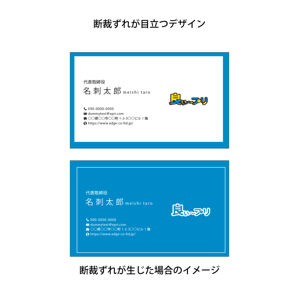 商品によっては製造工程の都合により、断裁ずれが大きくなることがあります。そのため、上の図のようなデザインは、断裁のずれが目立つ可能性が高いためお勧めできません。